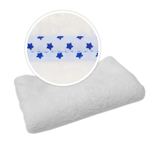 Dětská deka s modrým hvězdičkovým lemem pro sublimační tisk. Deka z měkkého, na dotek příjemného polyesteru, lemovaná bavlněným lemováním. Polský výrobek.