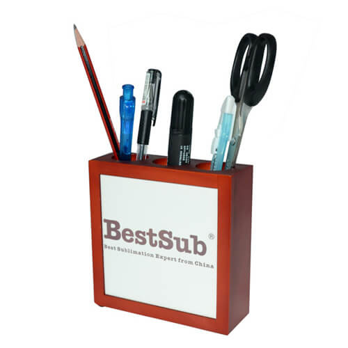 Dřevěný stojan na svíčky nebo pera. Potisk se provádí na keramickou desku 110 x 110 mm, která se prodává samostatně. Do vyfrézované plochy se vlepí hotová deska s plošnými spoji.
