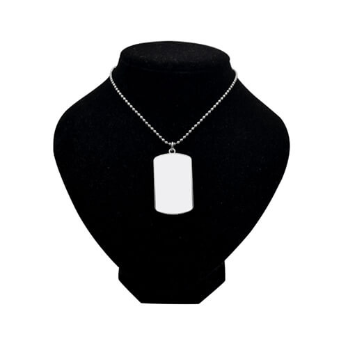 Kovový přívěsek ve tvaru zaobleného obdélníku na "kuličkovém" řetízku pro sublimační potisk. Otisk je zhotoven na kovové destičce připevněné k přívěsku, která by měla být vlepena do pole vyfrézovaného do přívěsku. Hotový výrobek je vhodný jako originální dárek apod.