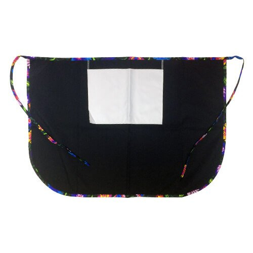 Kuchyňská zástěra vázaná v pase v černé barvě s bílou kapsou pro sublimační potisk.